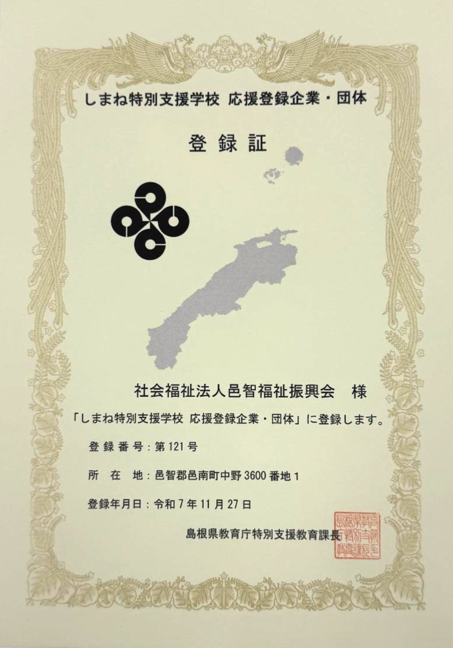 この度、当法人は「しまね特別支援学校 応援登録企業・団体」として、島根県に登録されました。この登録制度は、特別支援学校生徒の皆様の就労に向けた職業教育を応援する企業・団体が、企業見学や現場実習の受け入れなどを通じて、生徒の皆様の学びや成長を支援するものです。こうした取組により、生徒の皆様は就労に必要な力を身に付け、高等部卒業後の就労へと繋げています。